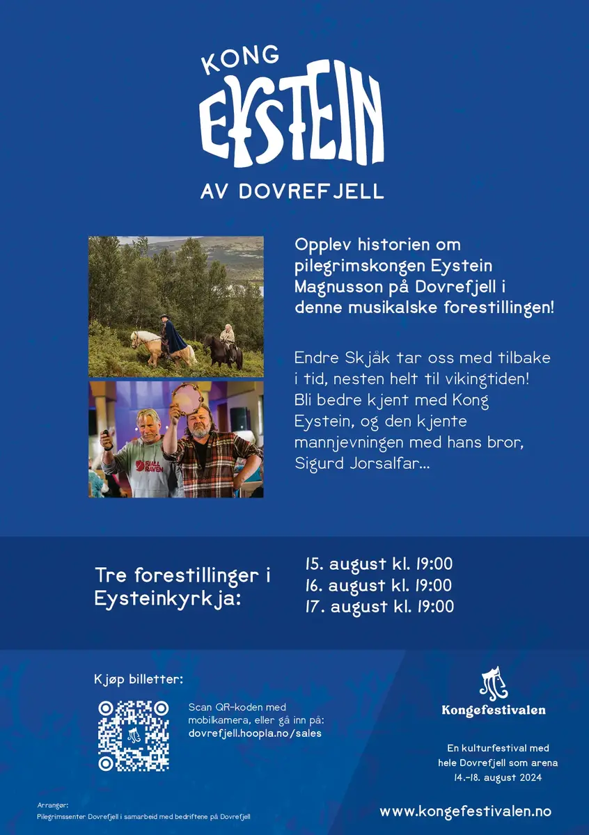 KongefestivalenKongefestivalen er en kulturfestival med hele Dovrefjell om arena.Kongefestivalen arrangeres på Dovrefjell 14. - 18. august 2024. Foto: Roger Brendhagen Kongefestivalen 1/1 Åpne eller lukk bildetekst